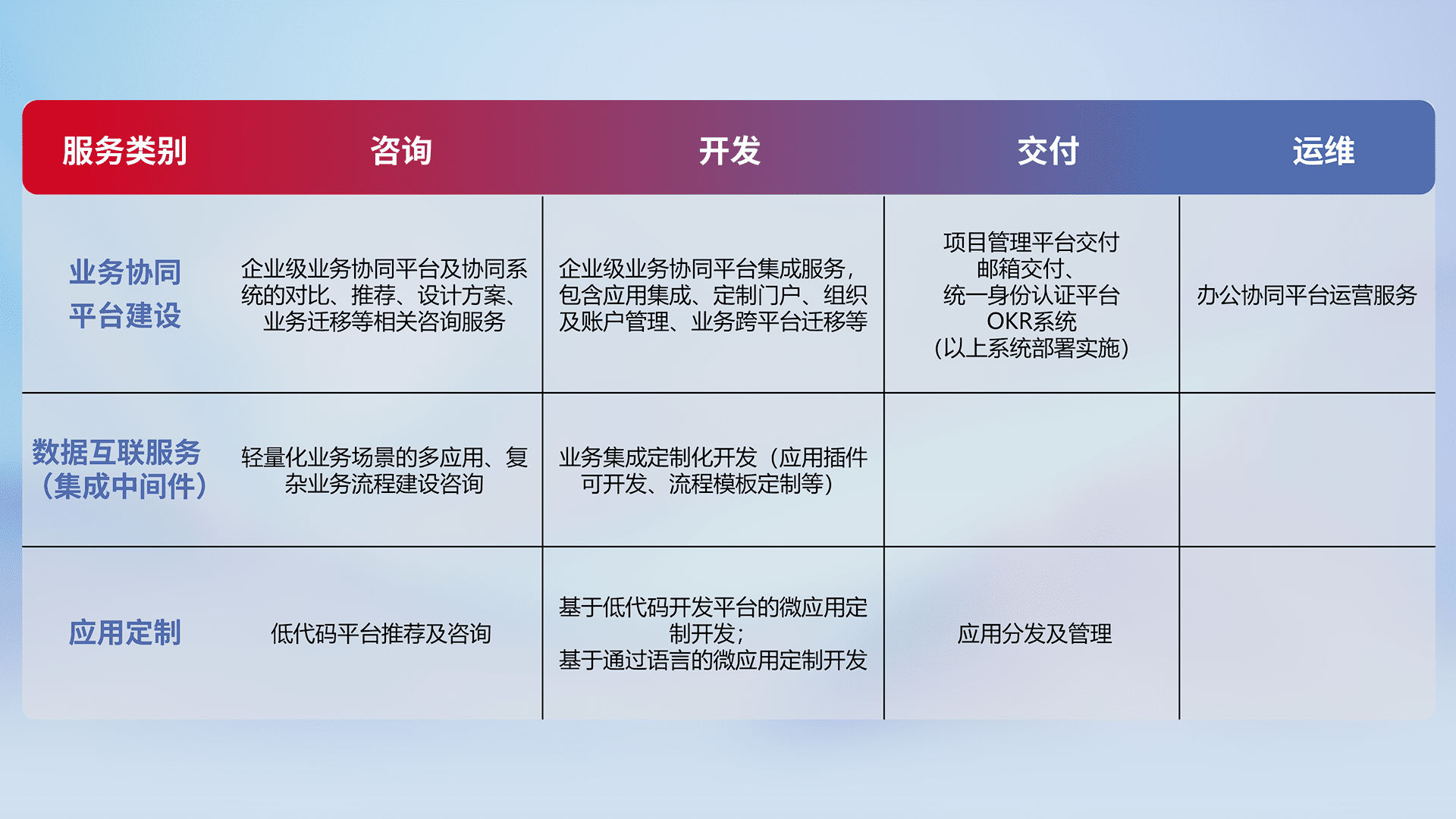 针对钉钉、、企微、、、、IDaas等平台级产品提供产品的规划、、、方案、、、交付、、、定制化开发等服务,,实现如统一协同办公、、、智能客户服务、、、、混合会议管理、、、智能数据查询、、、、等业务场景,,,,实现数字化转型。。